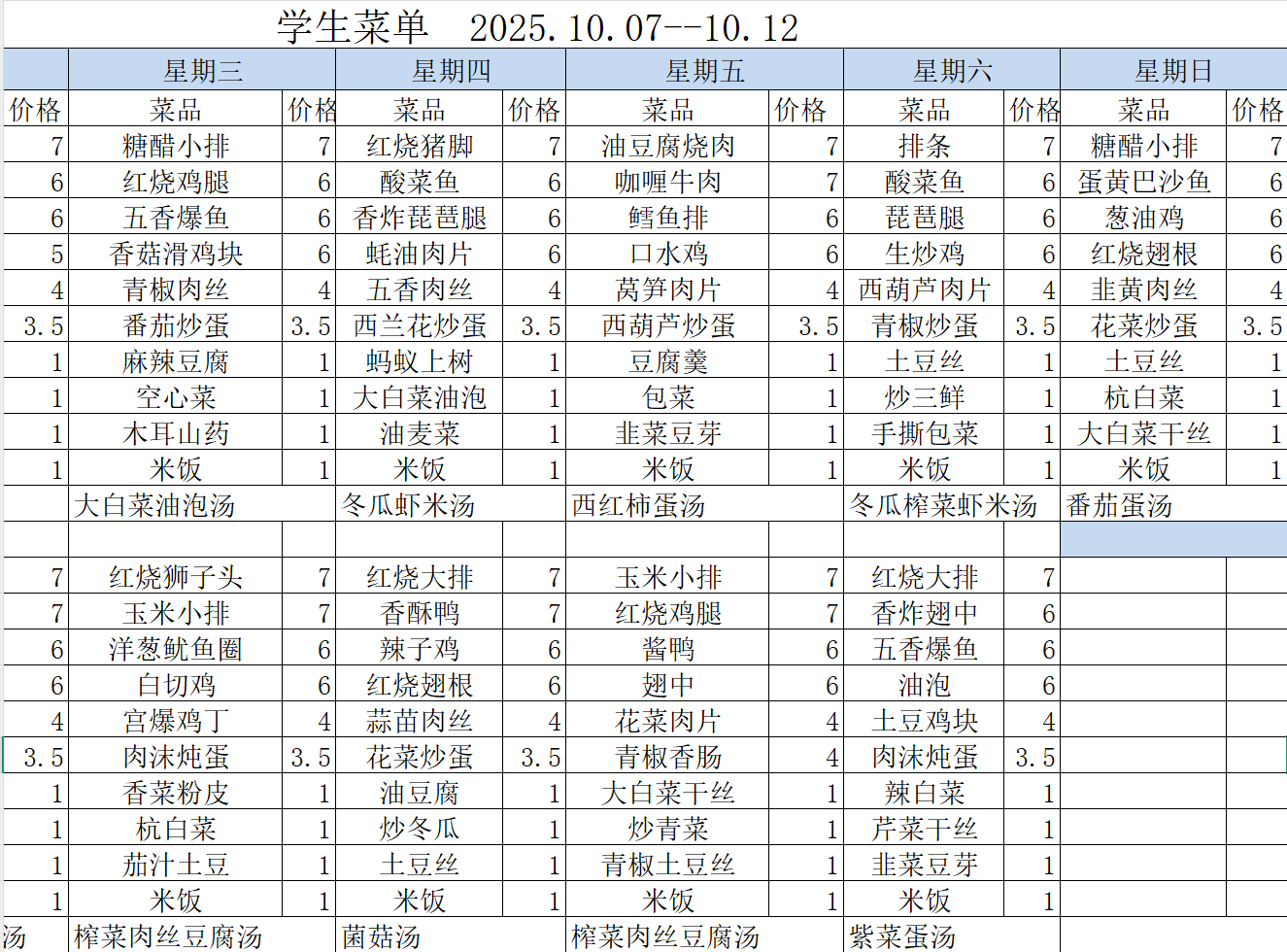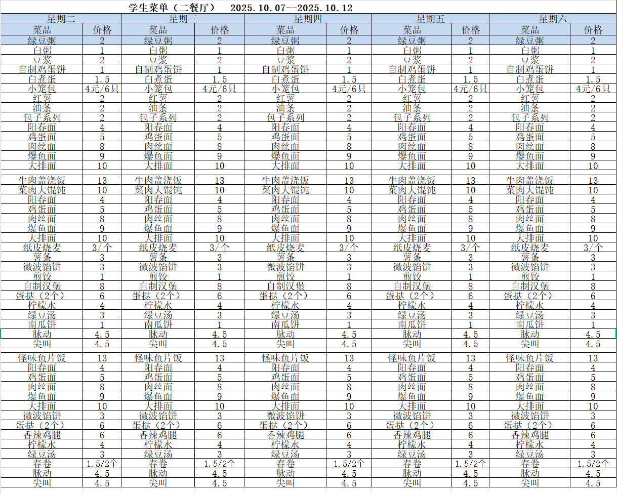 2025-2026学年第一学期学生餐厅第六周菜单